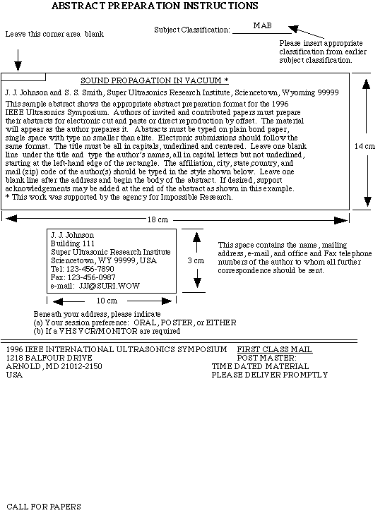 Papers are solicited describing original work in the field of ultrasonics. Poster and oral presentation formats will be used at the symposium. Prospective authors should note that poster sessions provide an alternative format which allows for greater flexibility and expanded audience interaction. The abstracts should be submitted in electronic form: e-mail to uffcabs@aol.com, or send a floppy disk with an ASCII file, if not possible, an abstract original and two copies should be provided. Please follow the following abstract preparation instructions and mail to: Ultrasonics Symposium, c/o LRW Associates, 1218 Balfour Drive, Arnold MD 21012-2150, USA.