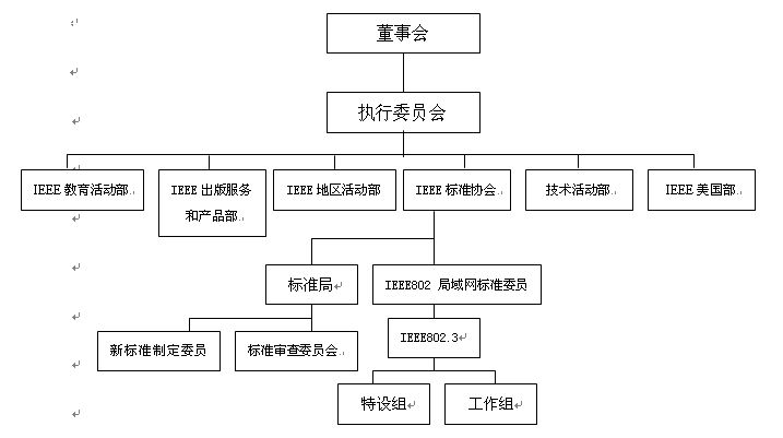 IEEE有着严密的组织机构,由主席(首席执行官 CEO)和执行委员会共同领导,每年选举一次。重大事项由理事会和代表大会进行决策,日常事务由执行委员会负责完成。IEEE设有电子自控设计、超导、毫 微米工艺、传感器和系统五个技术联合会(Council)(跨多个专业学会)和39个专业学会(Society),如动力工程、航天和电子系统、计算机、 通信、广播、电路与系统、控制系统、电子装置、电磁兼容、工业电子学、信息理论、工程管理、微波理论和技术、核和等离子科学、海洋工程、电力电子学、可靠 性、用户电子学等。此外,IEEE还根据会员的来源将IEEE的全球会员分为美国东北部、美国东部、美国中部、美国西南部、美国西部、加拿大、欧洲中东与 非洲、拉丁美洲和亚洲与太平洋地区等10个大区(Region),并设立了311个地区分会(Section)。对应IEEE全球总部的设置,IEEE每 个大区和地区分会都设有执行委员会;对应IEEE的专业学会,每个地区分会下还设专业委员会(Chapter)以及在拥有一定数量学生会员的大学和科研机 构下设立学生支会(Student Branch)。目前,IEEE有1570 个Chapter和1430个学生分会。 IEEE标准制订 作为全球最大的专业学术组织,IEEE也非常重视标准的制定工作。IEEE专门设有IEEE标准协会IEEE-SA(IEEE Standard Association),负责标准化工作。IEEE-SA下设标准局,标准局下又设置两个分委员会,即新标准制定委员会(New Standards Committees)和标准审查委员会(Standards Review Committees)。 IEEE的标准制定内容包括电气与电子设备、试验方法、原器件、符号、定义以及测试方法等多个领域。 IEEE现有42个主持标准化工作的专业学会或者委员会。为了获得主持标准化工作的资格,每个专业学会必须向IEEE-SA提交一份文件,描述该学会选择 候选建议提交给IEEE-SA的过程和用来监督工作组的方法。当前有18个学会正在积极地制定标准,每个学会又会根据自身领域设立若干个委员会进行实际标 准的制定。例如,我们熟悉的IEEE802系列标准,就是IEEE计算机专业学会下设的p802委员会负责主持的。IEEE802又称为LMSC(LAN /MAN Standards Committee,局域网/城域网标准委员会),致力于研究局域网和城域网的物理层和MAC层规范,对应OSI参考模型的下两层。LMSC执行委员会 (Executive Committee)又下设工作组(Working Group)、研究组(Study Group)、技术顾问组(Technical Advisory Group)等等。